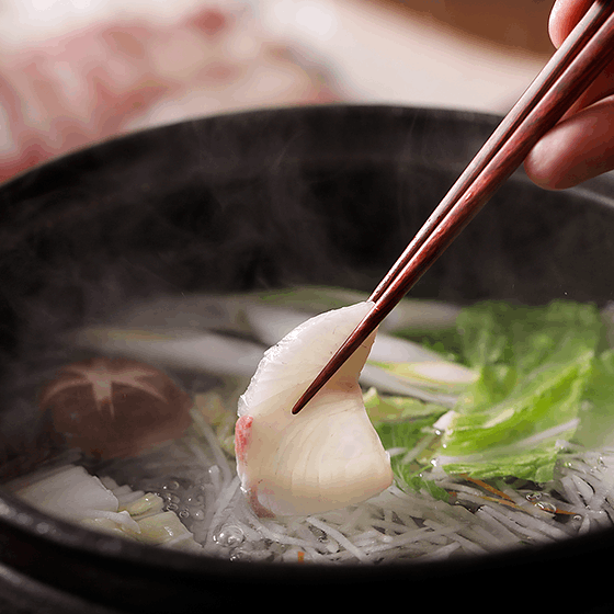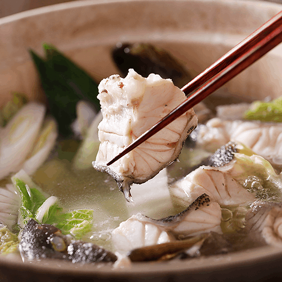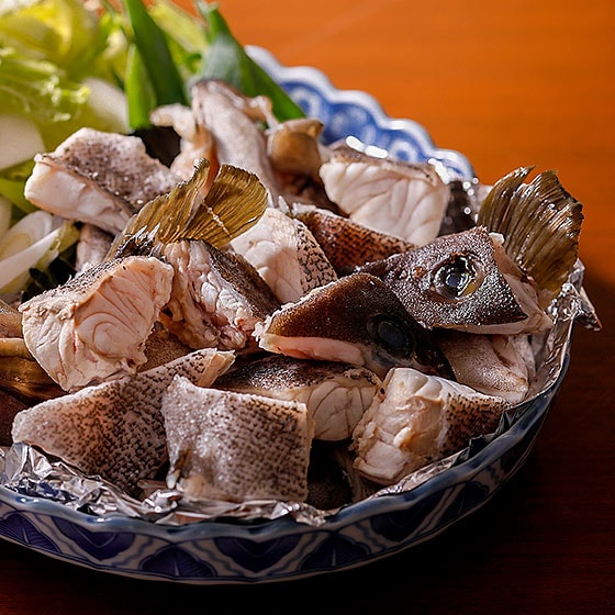 クエ鍋の美味しさの秘訣は、なんといっても身や骨から滲み出る出汁にあります。ゆえに今回ご用意したのは、頭、胸びれ、かまの部分などをぶつ切りにしたものです。ぶつ切りは骨付きですが、身はしっかりとついていますので、食べ応えは充分にあります。